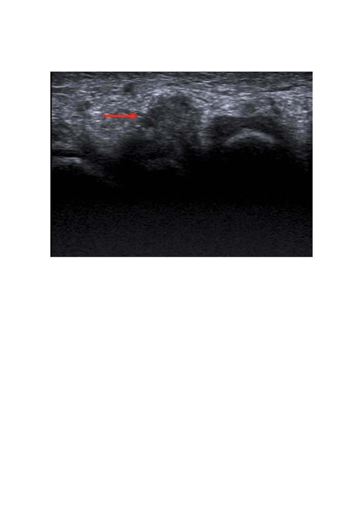 En corte transversal por acceso plantar se identifica una masa hipoecoica redondeada homogénea de bordes bien definidos en tercer espacio interdigital de 7 mm, compatible con neuroma de Morton.