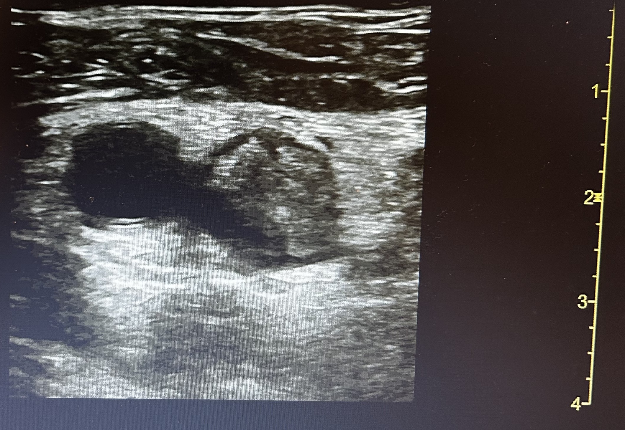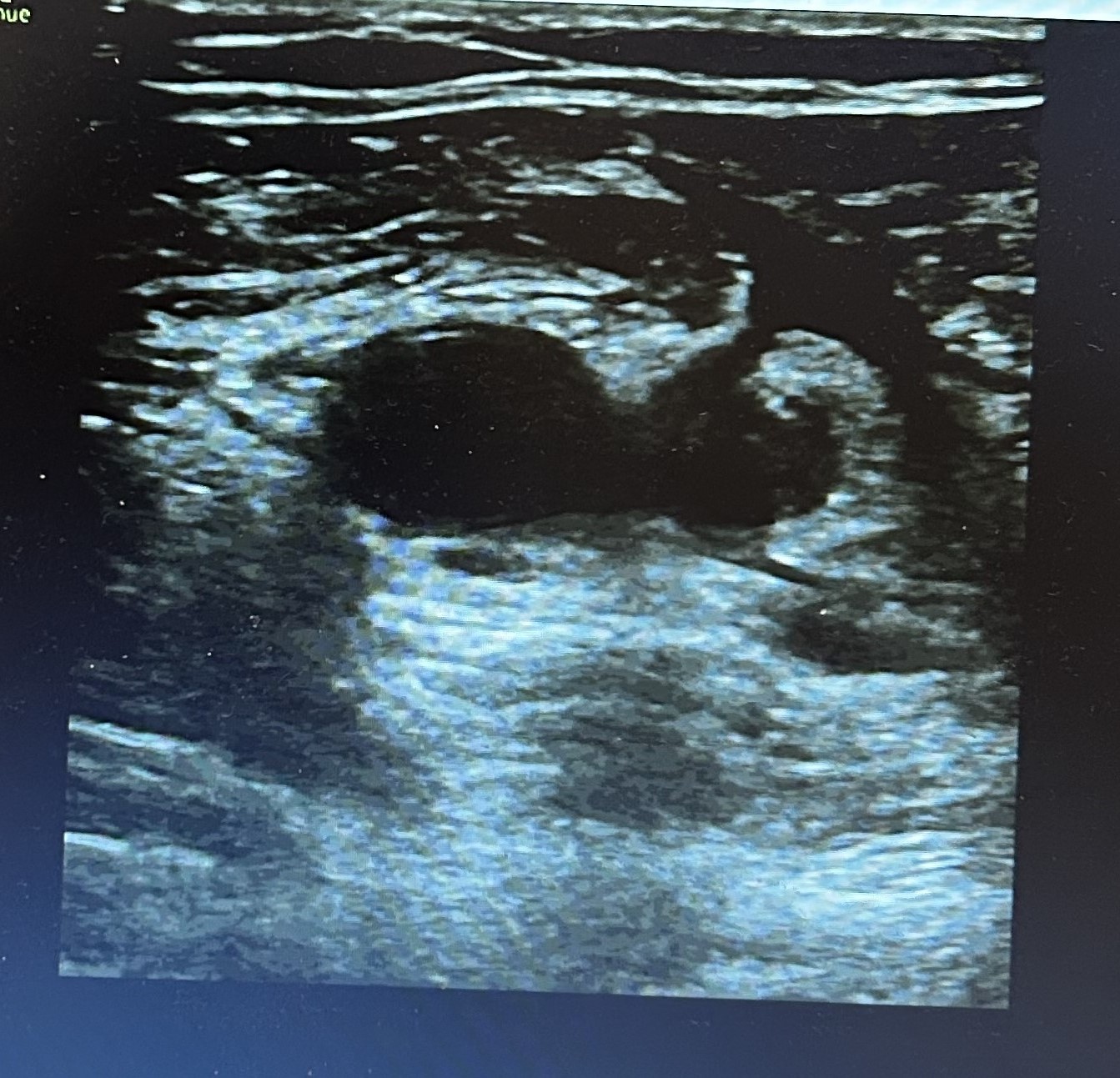 Ante cuadro sugerente de trombosis venosa se realiza ecografía-doppler venoso de la extremidad afectada objetivándose extensa Trombosis venosa profunda con afectación desde vena iliaca externa hasta territorio infrapoplíteo.